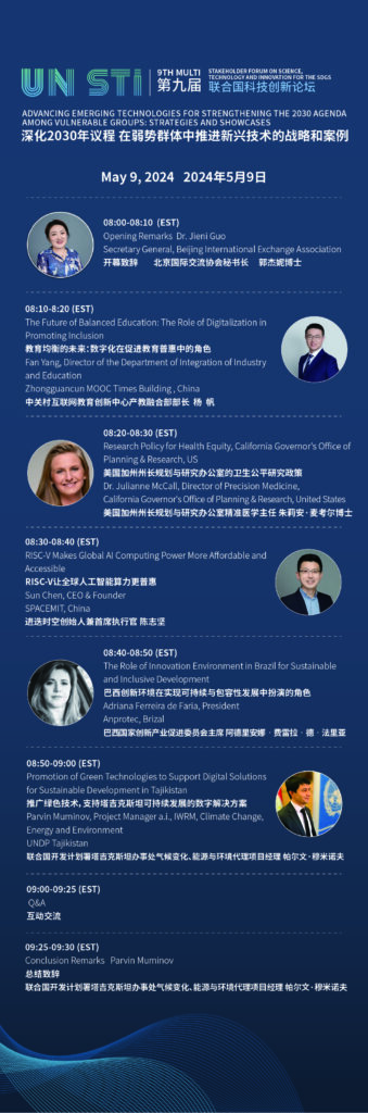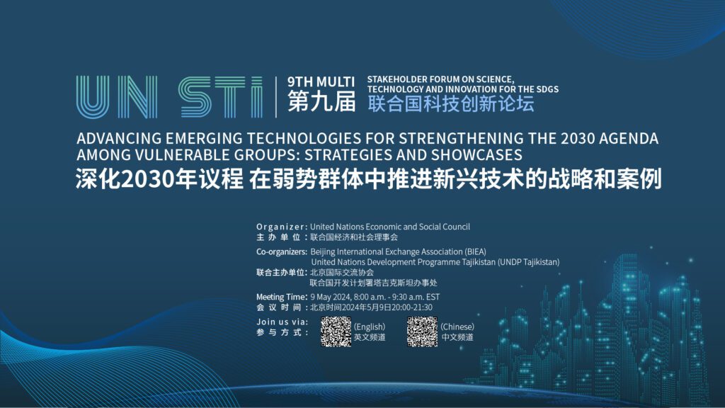 No dia 9 de maio de 2024, das 8h00 às 9h30, horário de Brasília, o Conselho Econômico e Social das Nações Unidas (ECOSOC), em parceria com a Associação Internacional de Intercâmbio de Pequim (BIEA) e o Programa das Nações Unidas para o Desenvolvimento do Tadjiquistão (PNUD Tadjiquistão), realizará uma reunião virtual com o tema “Avanço das tecnologias emergentes para fortalecer a agenda 2023 entre grupos vulneráveis: estratégias e showcases”.