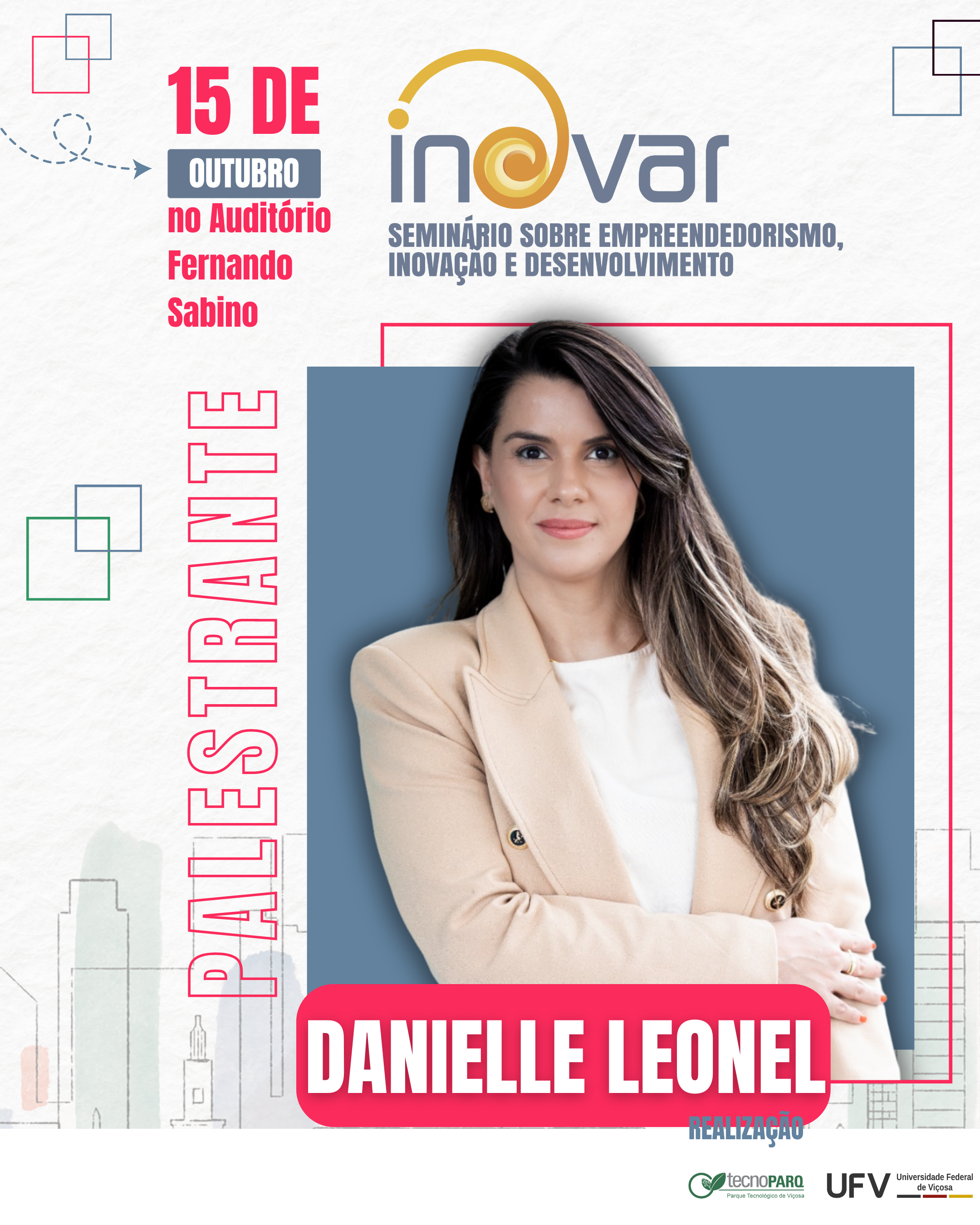 - 18h20: Palestra Magna: Danielle Leonel – Head de Inovação no HUB CNA Digital e ex-colaboradora do tecnoPARQ/UFV, eleita pela Revista Exame como uma das 11 mulheres transformando o mercado de inovação no Brasil.