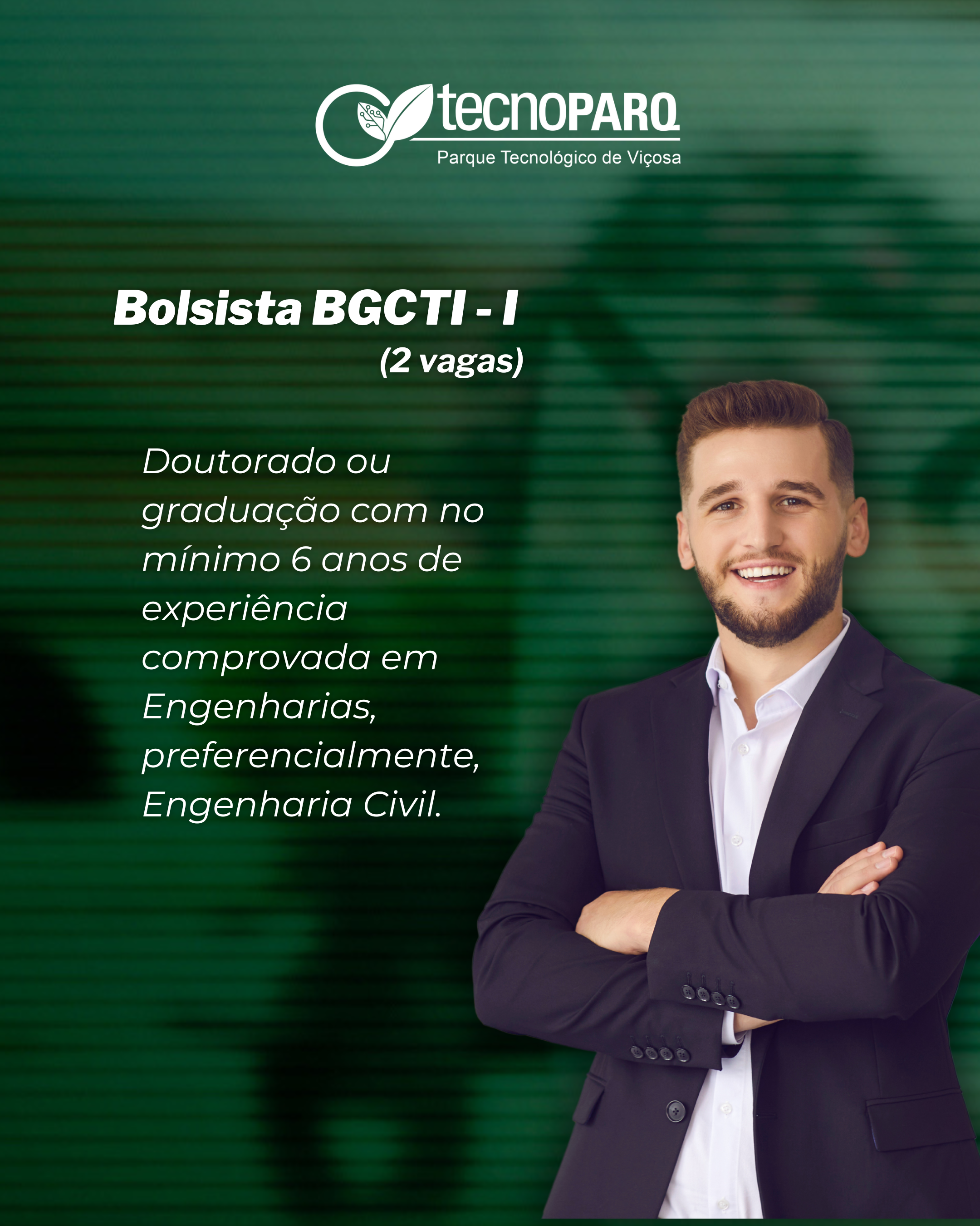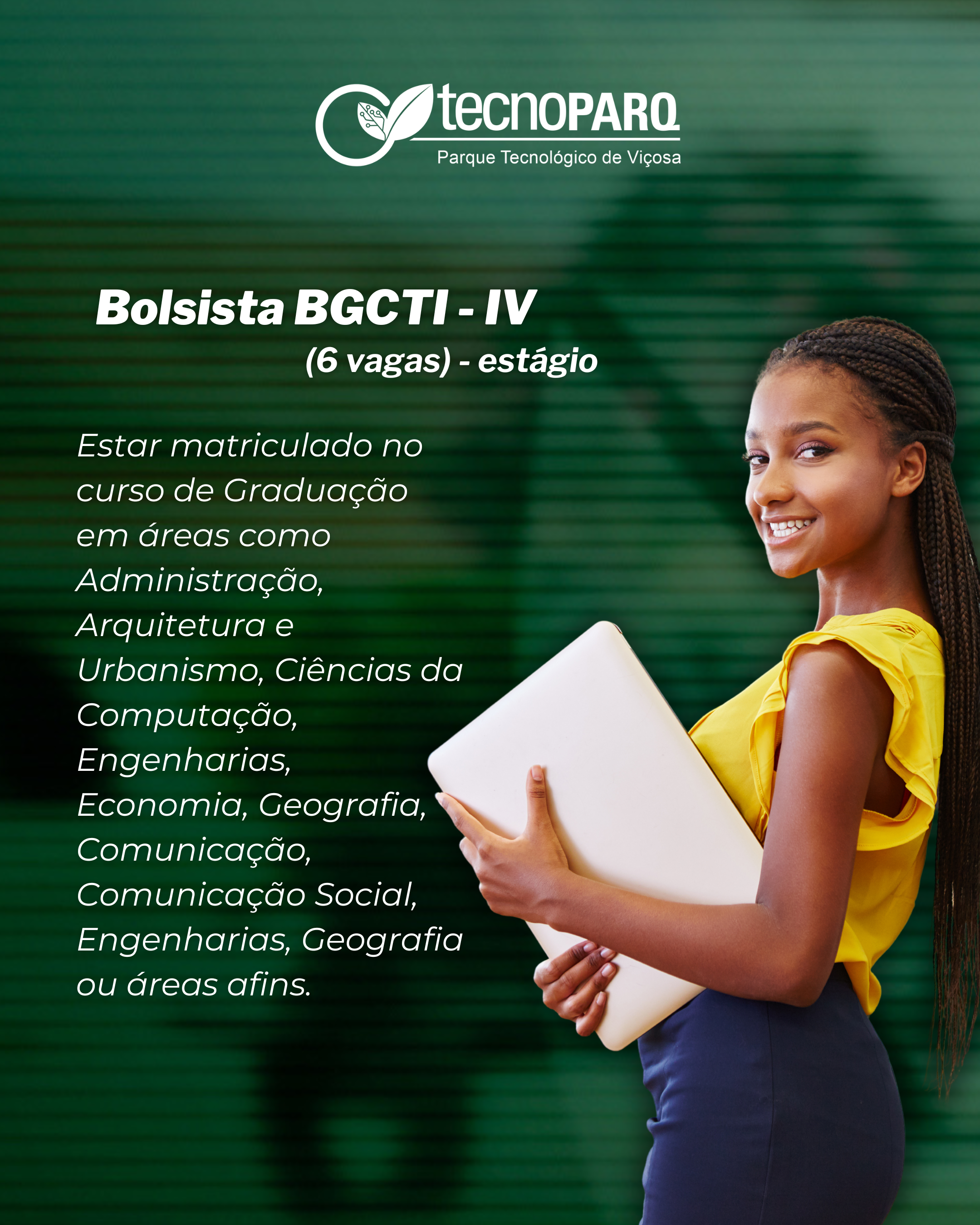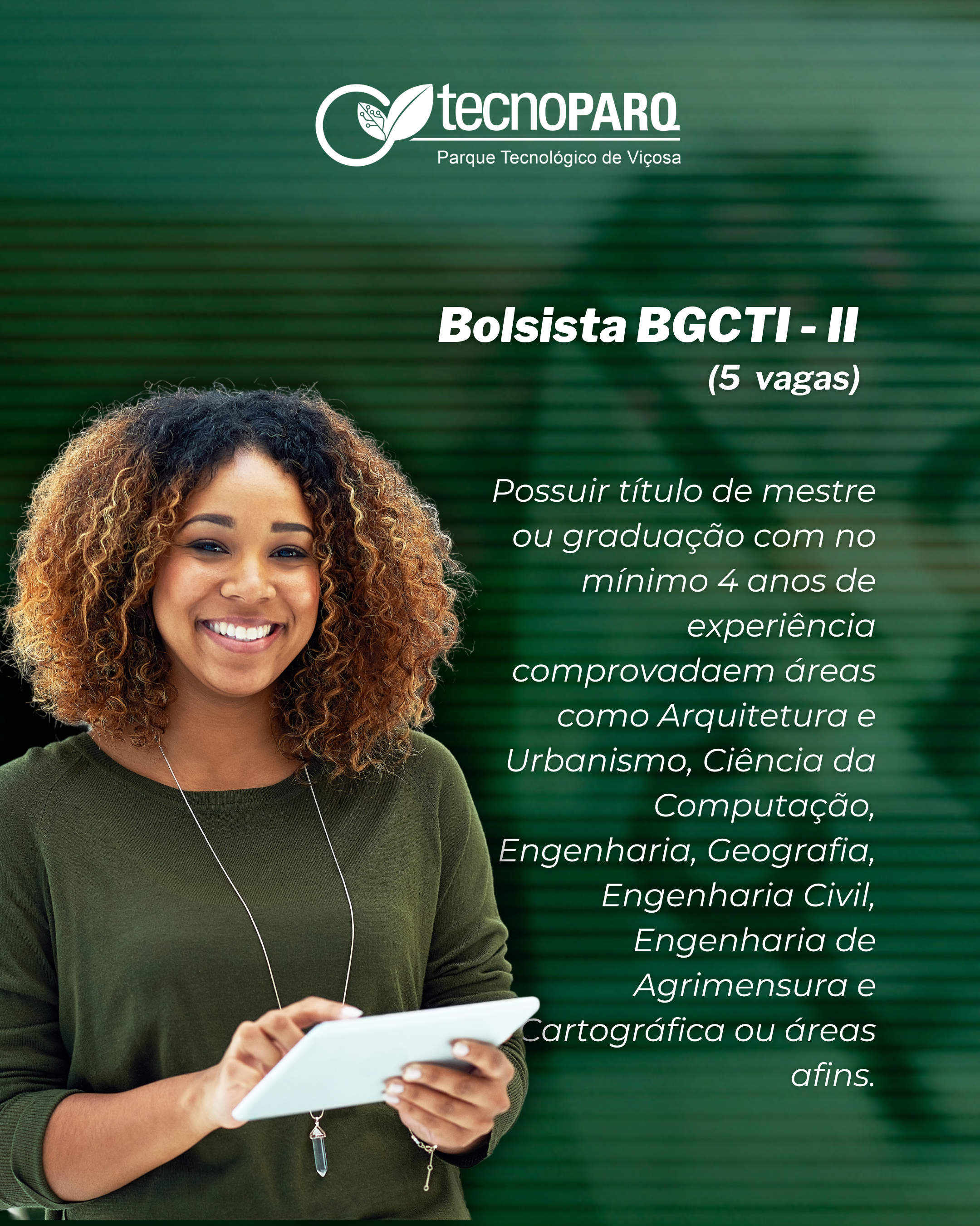 - Bolsas BCTI – I (2 vagas) e BCTI – II (5 vagas): Seja parte de um time dedicado à pesquisa, desenvolvimento tecnológico e inovação. Procuramos profissionais com experiência comprovada em áreas como Transformação Digital, Inteligência Artificial e Planejamento Territorial.